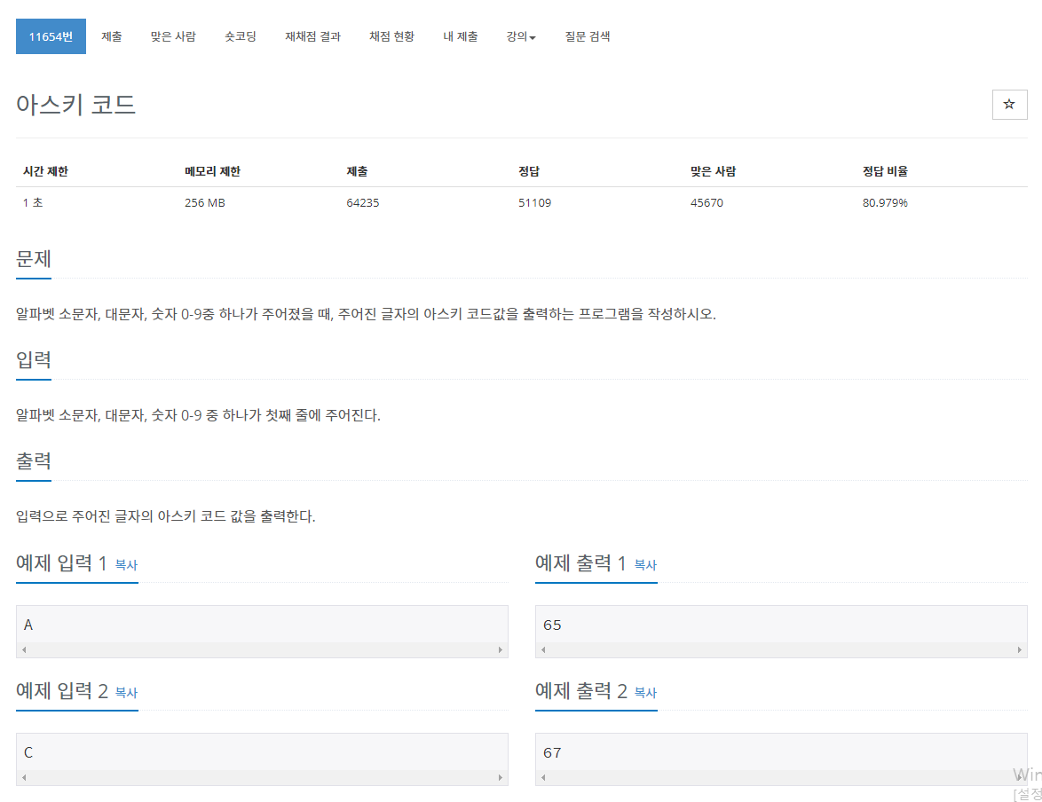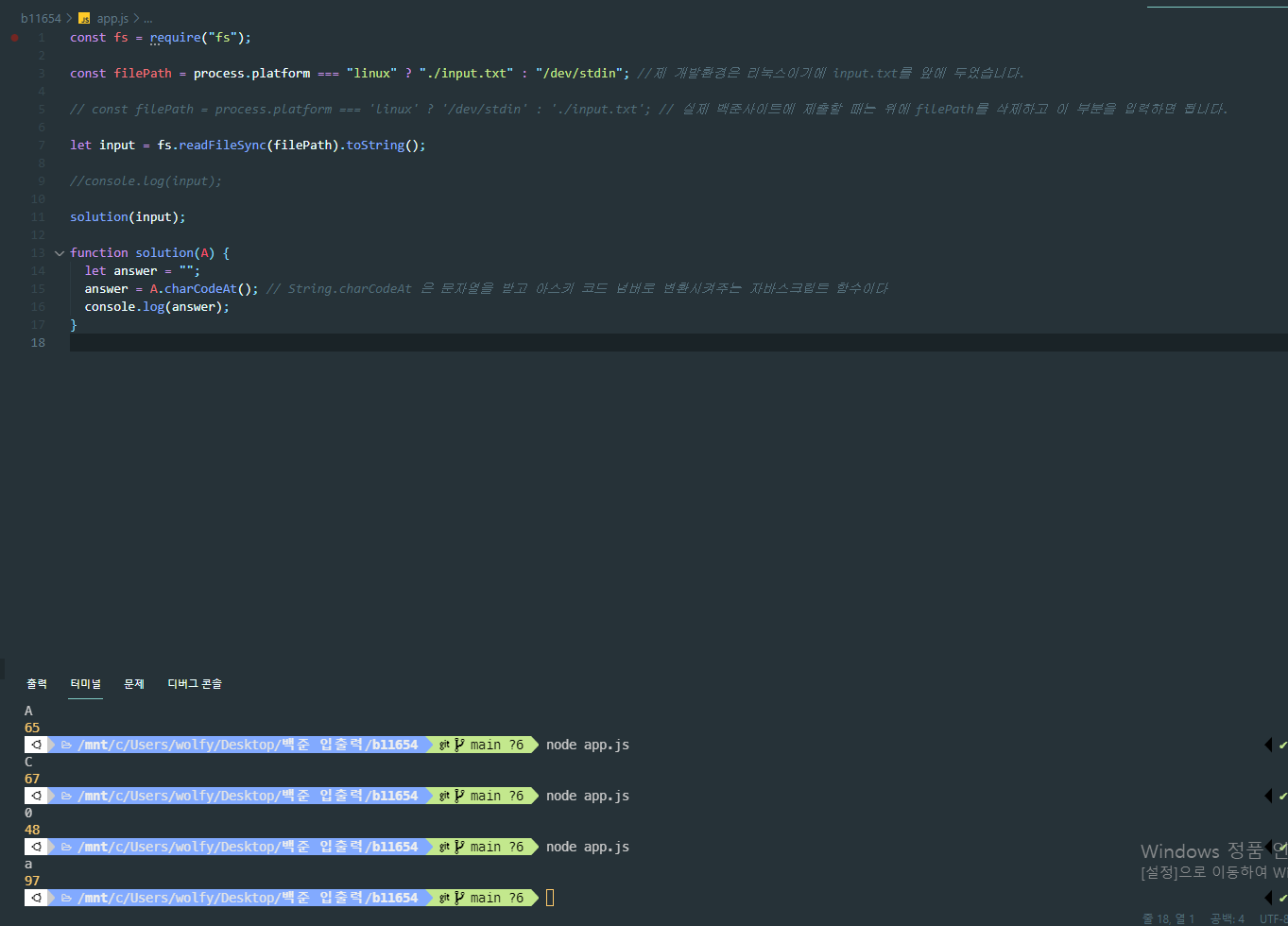 answer = A.charCodeAt(); // String.charCodeAt 은 문자열을 받고 아스키 코드 넘버로 변환시켜주는 자바스크립트 함수이다