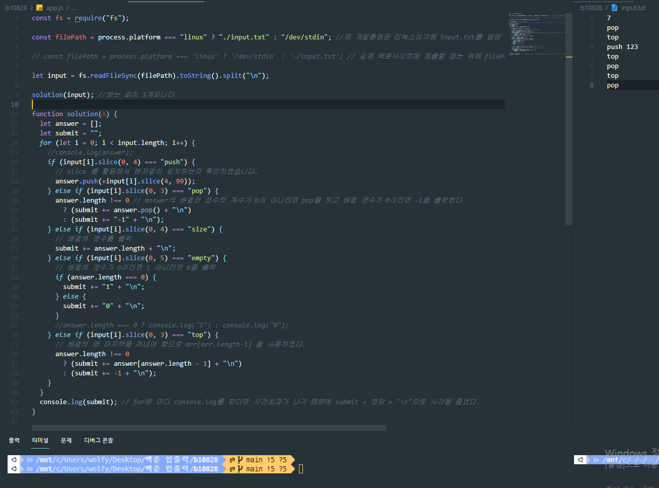 answer.length !== 0 // answer의 배열안 정수의 개수가 0이 아니라면 pop을 하고 배열 갯수가 0이라면 -1을 출력한다