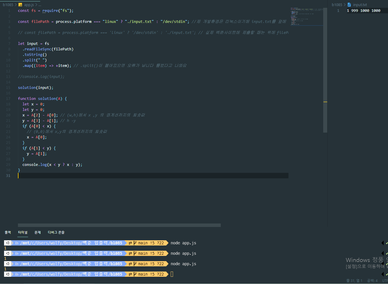 x = A[2] - A[0]; // (w,h)에서 x ,y 의 경계선까지의 최솟값