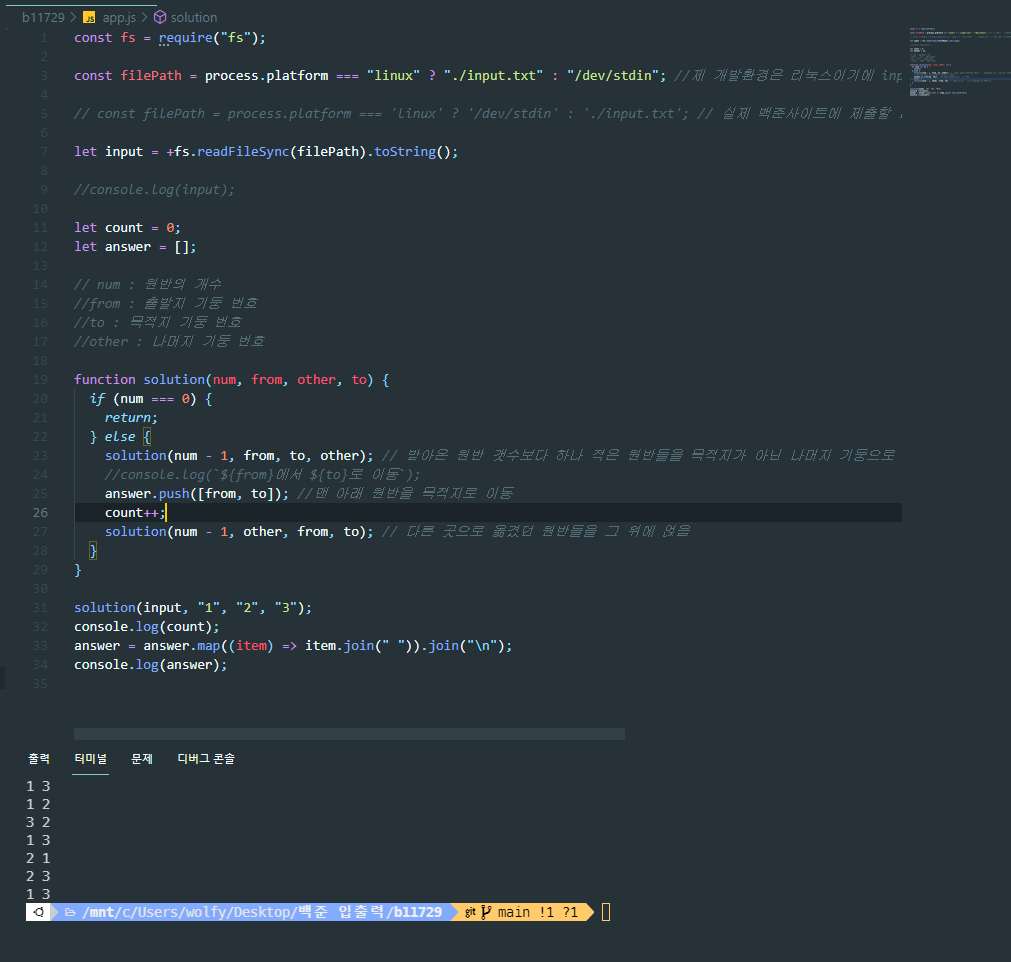 solution(num - 1, from, to, other); // 받아온 원반 갯수보다 하나 적은 원반들을 목적지가 아닌 나머지 기둥으로 옮김