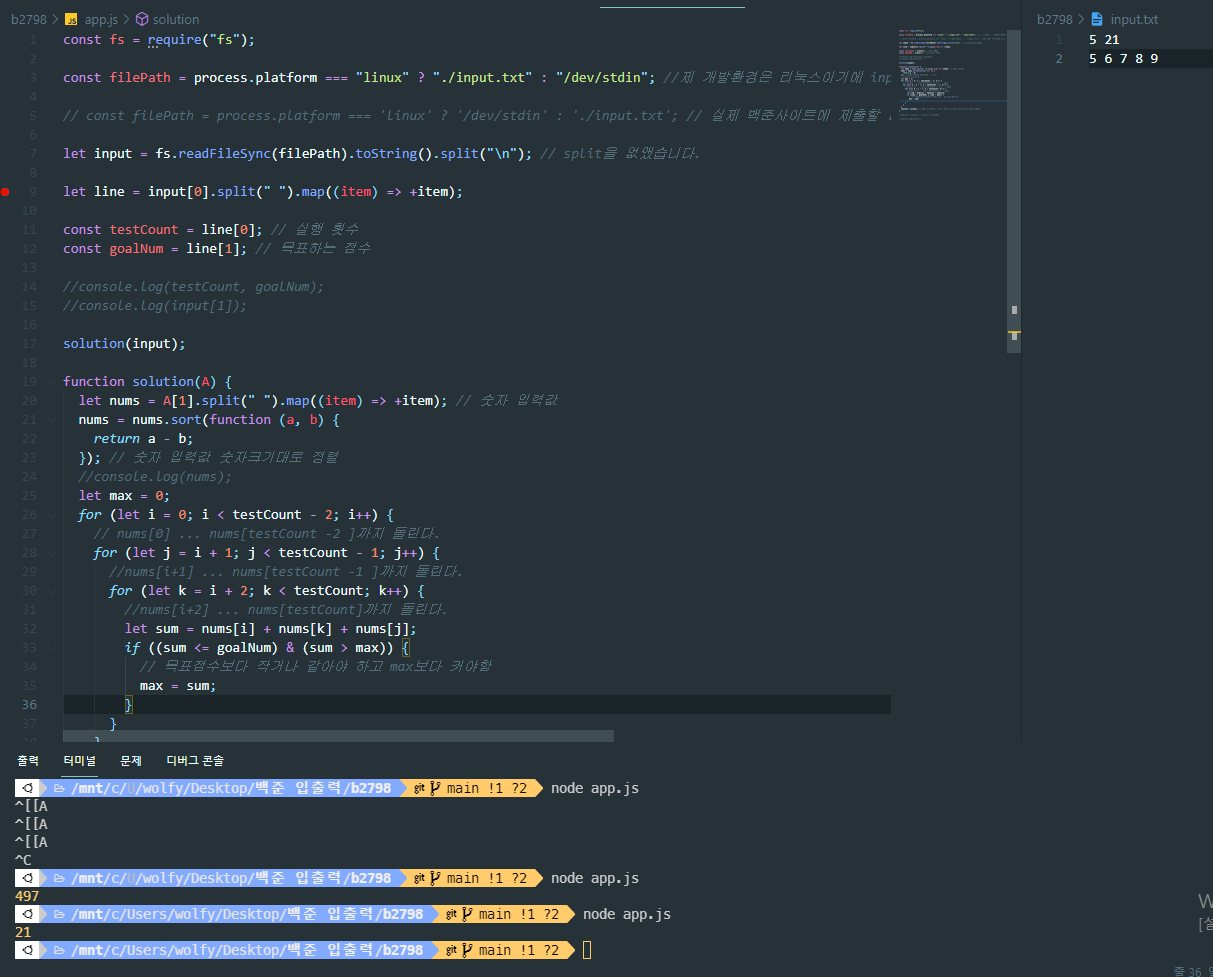 console.log(max); // 3가지의 숫자를 더해야 함으로 3개의 for문을 통해 풀었습니다.