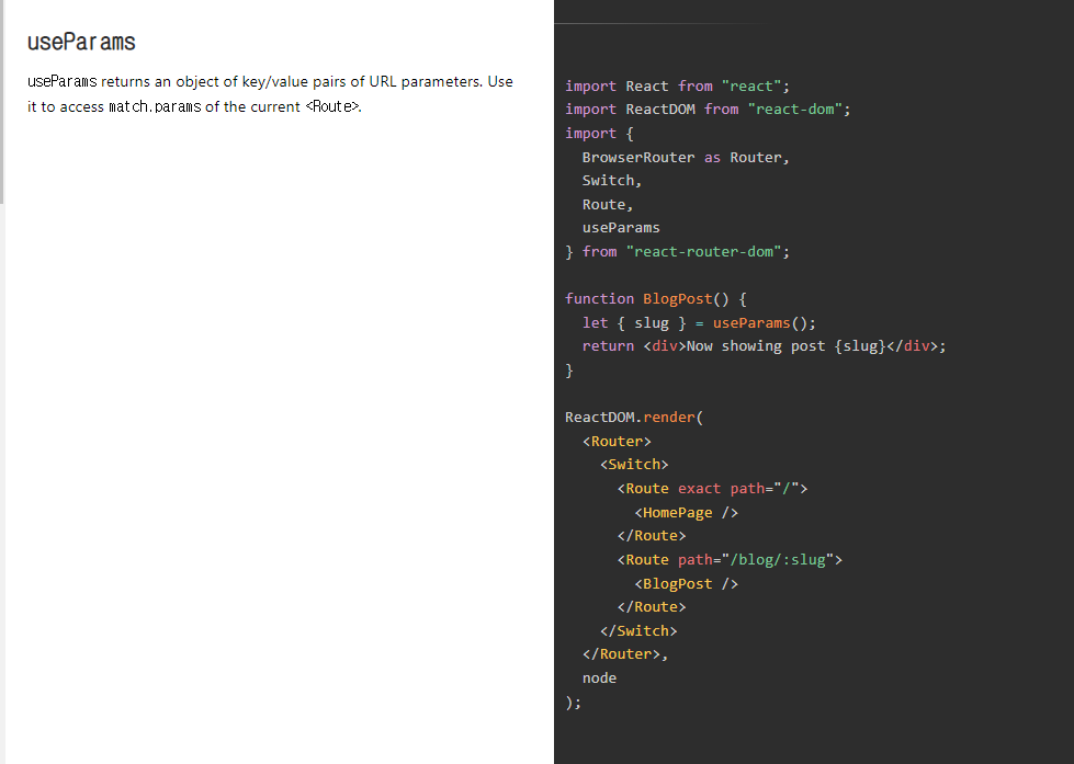 useParams useParams는 URL 매개 변수의 키/값 쌍의 개체를 반환합니다. 현재 <Route>의 match.params에 액세스할 때 사용합니다.