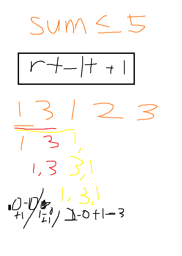 합이 5이하가 되는 연속부분수열은 {1}, {3}, {1}, {2}, {3}, {1, 3}, {3, 1}, {1, 2}, {2, 3},