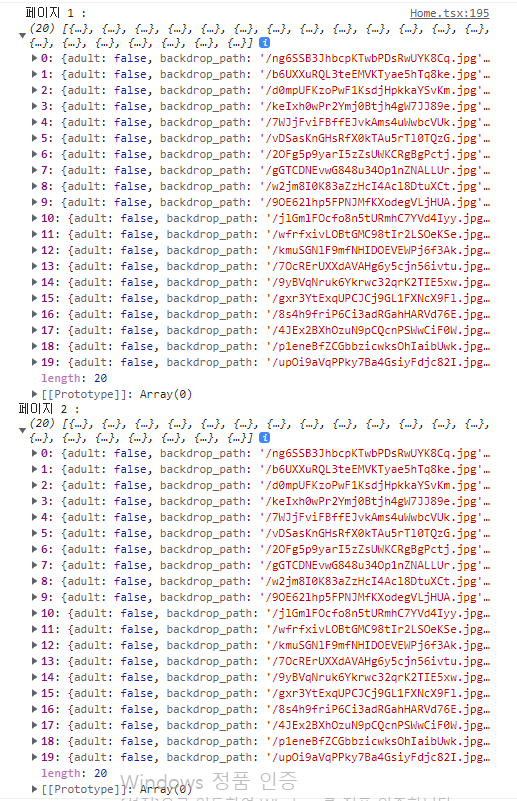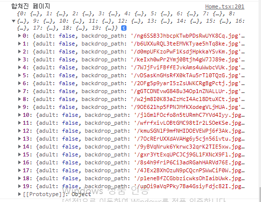 페이지 1과 페이지 2의 데이터를 합치려고 하였으나 ...Spread Operator (전개연산자) 를 사용하였을 때 20개의 값밖에 나오지 않았다. 이유는 오브젝트 안에 오브젝트를 전개하려고 하여서인지 정확히는 잘 모르겠다.