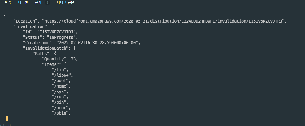 aws cloudfront create-invalidation --profile=[사용자 아이디] --distribution-id [CloudFront ID] --paths /*