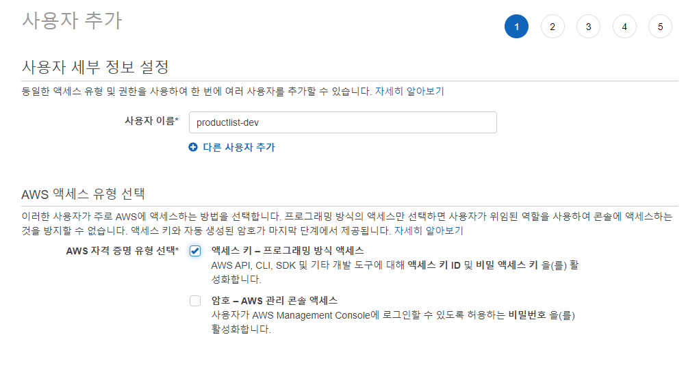 사용자 이름을 입력하시고 액세스 키 - 프로그래밍 방식 액세스에 체크하고 생성합니다.