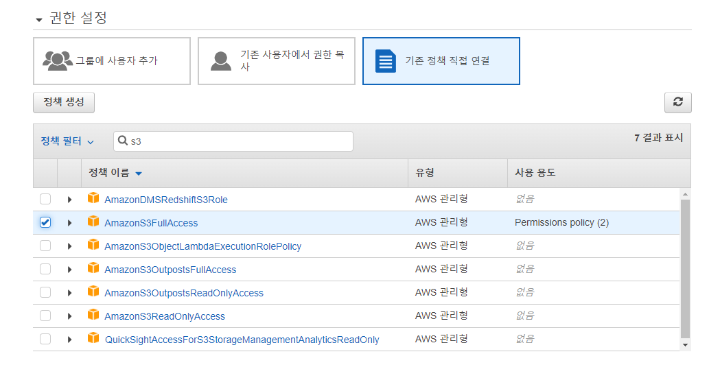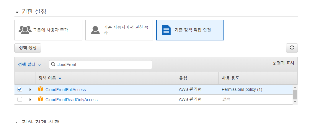 기존 정책 직접 연결 탭에서 AmazonS3FullAcess와 CloudFrontFullAccess 를 체크해줍니다.