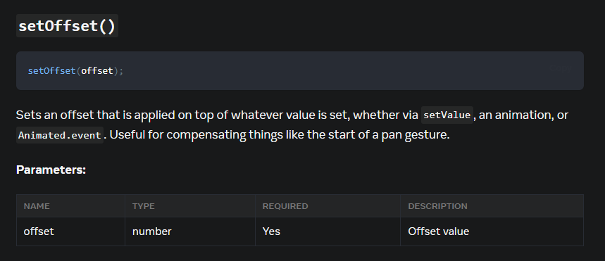 setValue, 애니메이션 또는 Animated.Event를 통해 설정된 값 위에 적용되는 오프셋을 설정합니다. 팬 제스처의 시작과 같은 것들을 보상하는 데 유용합니다.