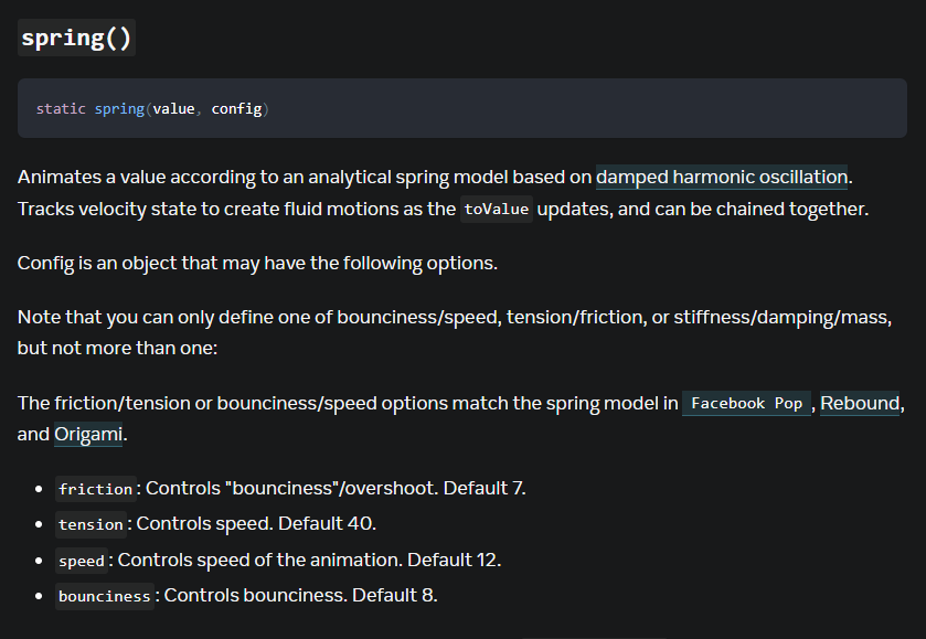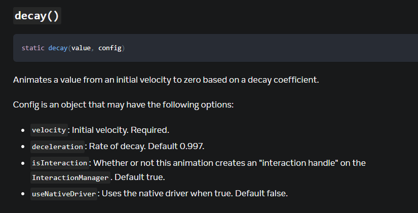- Animated.decay() starts with an initial velocity and gradually slows to a stop.