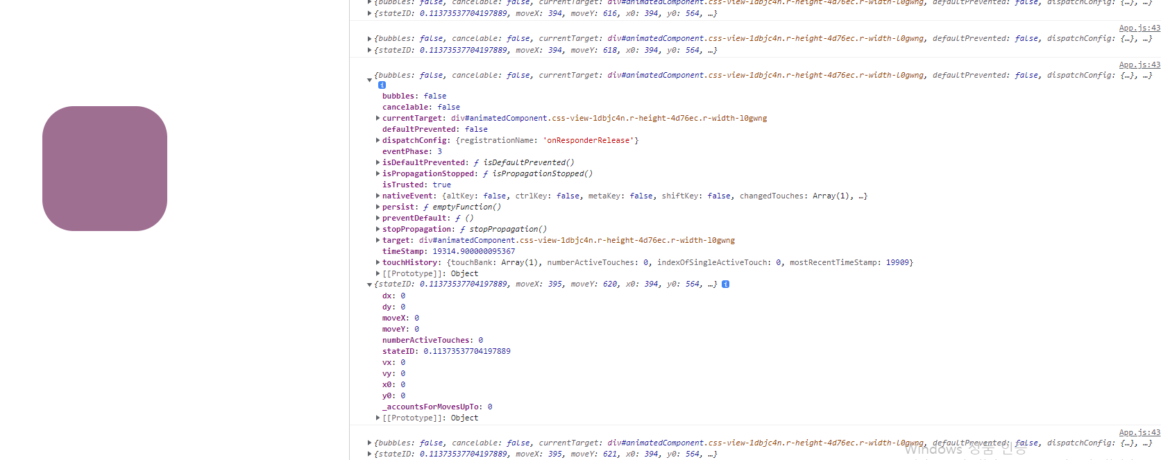 이렇게 setValue와 panResponder을 사용하게 되면 사용자의 터치를 인식하여 움직이게 되고 interpolate를 이용한 애니메이션 값도 정상적으로 작동이 됩니다