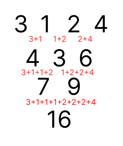 가장 윗줄에 1부터 N까지의 숫자가 한 개씩 적혀 있다. 그리고 둘째 줄부터 차례대로 파스칼 의 삼각형처럼 위의 두개를 더한 값이 저장되게 된다. 예를 들어 N이 4 이고 가장 윗 줄에 3 1 2 4 가 있다고 했을 때, 다음과 같은 삼각형이 그려진다.