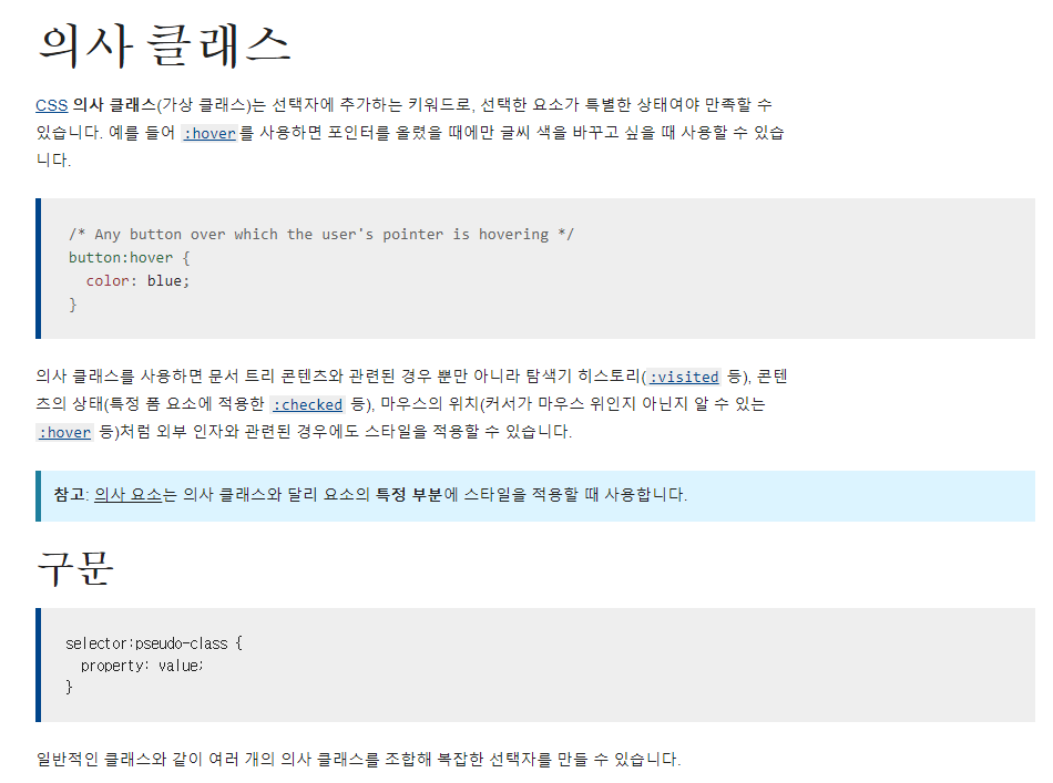 CSS 의사 클래스(가상 클래스)는 선택자에 추가하는 키워드로, 선택한 요소가 특별한 상태여야 만족할 수 있습니다. 예를 들어 :hover를 사용하면 포인터를 올렸을 때에만 글씨 색을 바꾸고 싶을