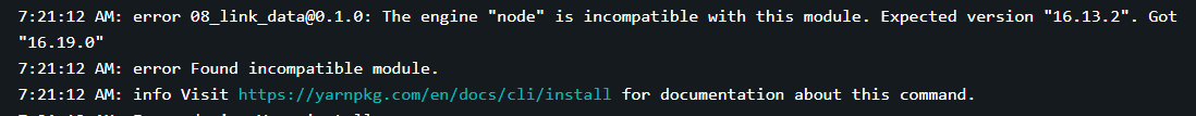 7:21:12 AM: error 08_link_data@0.1.0: The engine "node" is incompatible with this module. Expected version "16.13.2". Got "16.19.0"7:21:12 AM: error Found incompatible module.