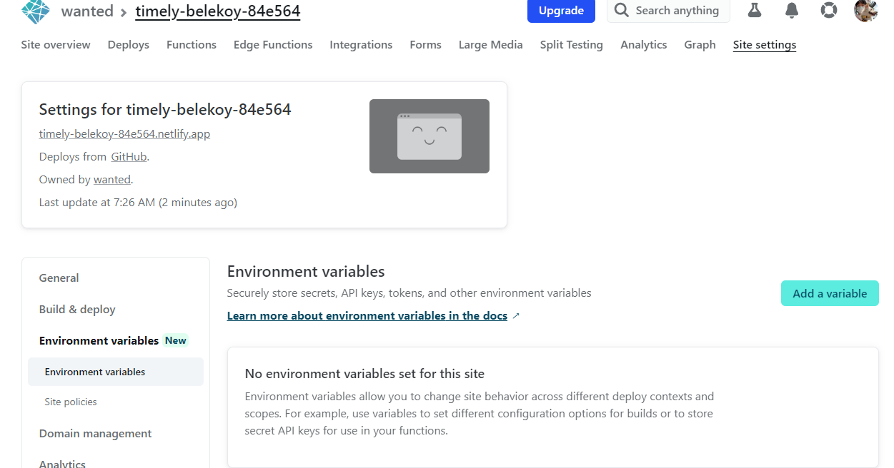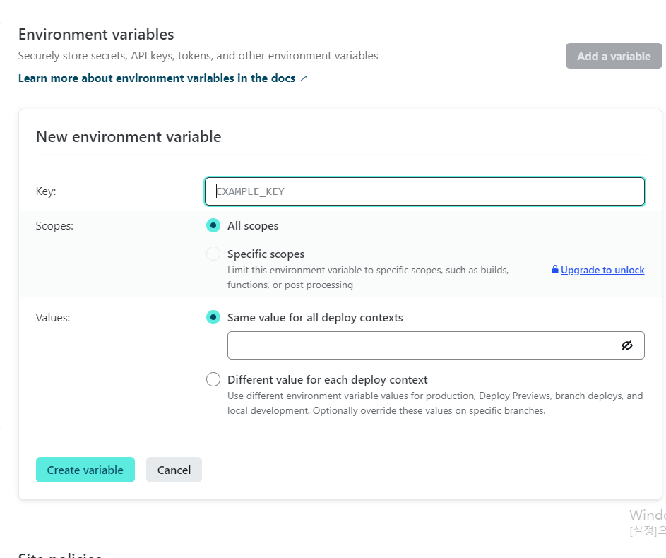 배포 프로젝트의 delpoy 셋팅에 들어가서 왼쪽 탭 Environment variables를 눌러줍니다.