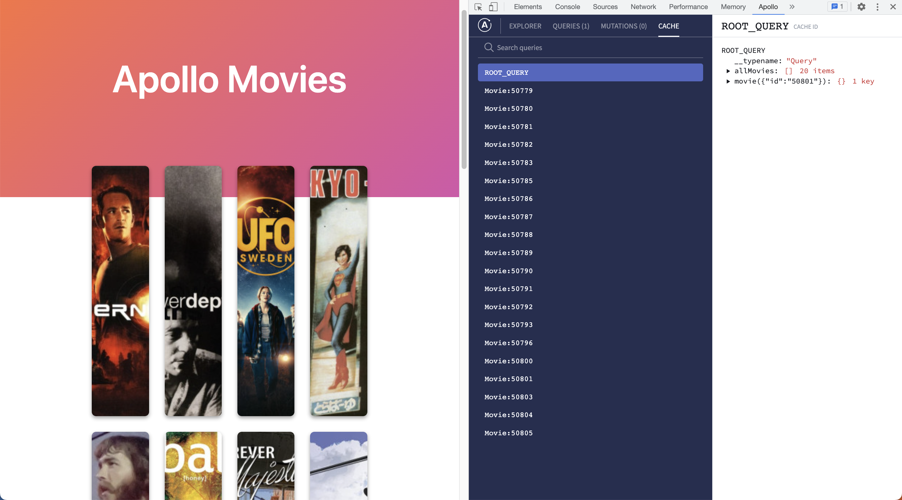 Apollo client extension을 설치하게 되면 Apollo에서 관리하는 캐시 메모리를 볼 수 있습니다. 아폴로는 처음에 불러온 데이터를 캐시 메모리에 저장해서 똑같은 데이터를 볼 때 새로 불러오지 않고 캐시 메모리에 저장된 값을 불러와 유저에게 더 빠르게 보여주는 기능을 제공하고 있습니다. 캐시 메모리는 브라우저 메모리에 저장됩니다.