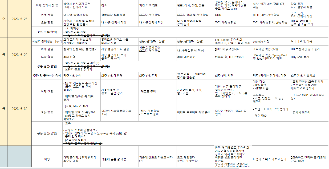 백앤드, 프런트앤드 함께 모여 협업하는 것이 처음입니다. 그리고 모여서 개발만 하는 것이 아닌 기획을 다 같이 하고, 디자인을 같이 하는 경험이 처음인데 팀원분들이 잘 리드해 줘서 팀 프로젝트를 하는 방법에 대해 차츰 익숙해지는 것 같습니다. 또한 선배 개발자들이 일정 안에 소프트웨어 개발을 완료할 수 있는 여러 방법(사용자 스토리, 스프린트, 그라운드 룰)을 만들어놓은 것을 실천해 가며 몸으로 체화하는 것이 재미있습니다.