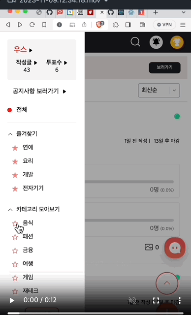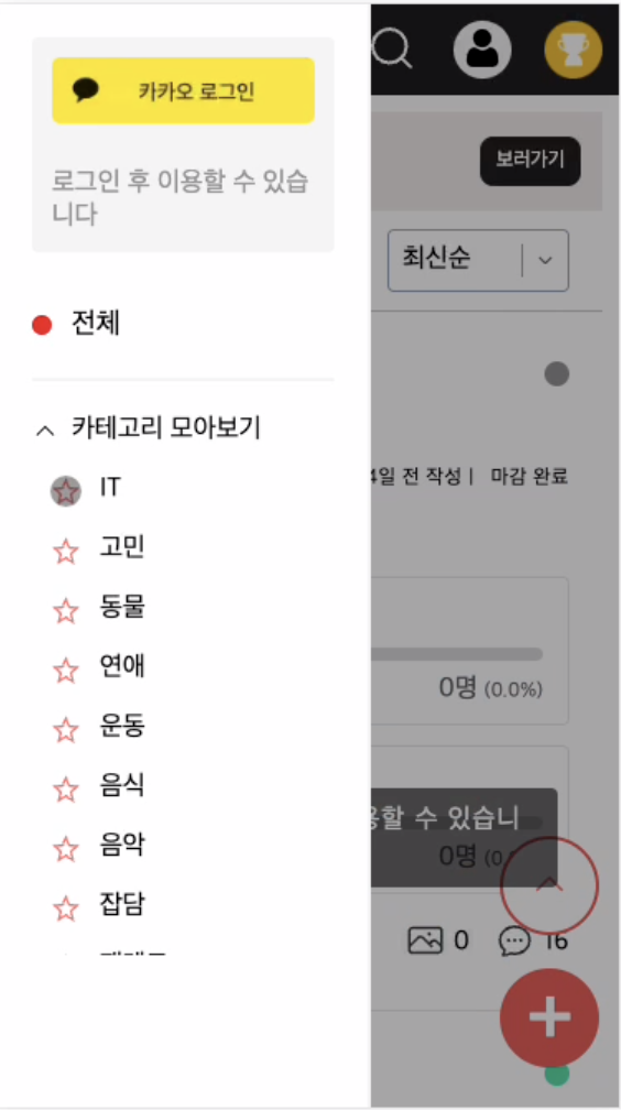'사용자 정보 및 카테고리 정보가 있는 사이드바가 열렸습니다. 사이드바 닫기 버튼을 누르거나 ESC를 누르면 닫을 수 있습니다.';