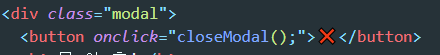 - 버튼에 onclick="closeModal();" 이라는 함수값을 넣어줍니다 (함수 이름은 달라도 상관 없습니다)