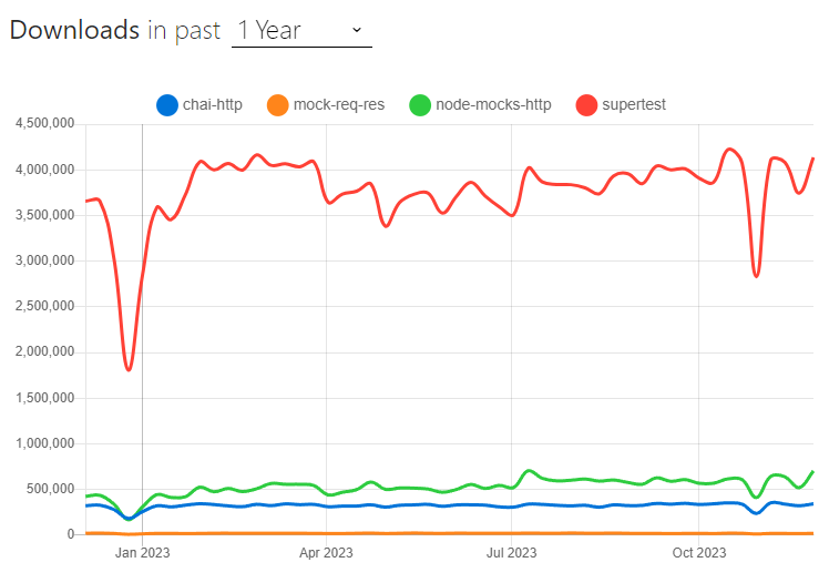Comparing trends for chai-http 4.4.0 which has 349,053 weekly downloads and unknown number of GitHub stars vs. mock-req-res 1.2.1 which has 20,204 weekly downloads and unknown number of GitHub stars vs. node-mocks-http 1.13.0 which has 709,610 weekly downl