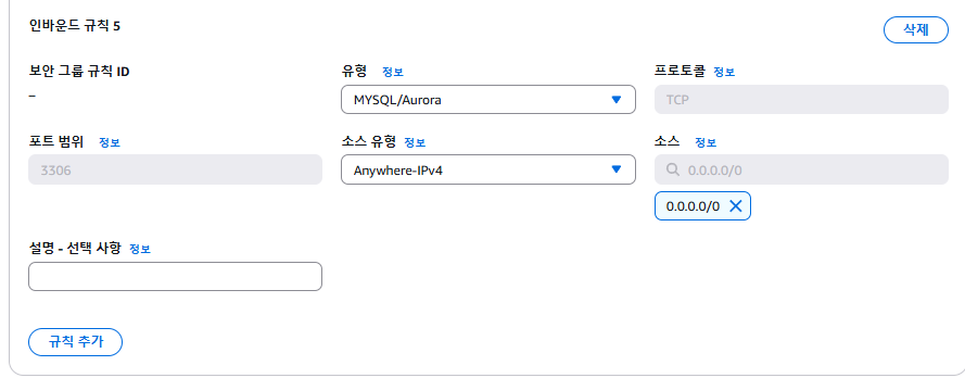 그리고 EC2에 접속해서 RDS에 연결하기 때문에 EC2의 보안그룹에서 3306 포트를 추가해줬습니다