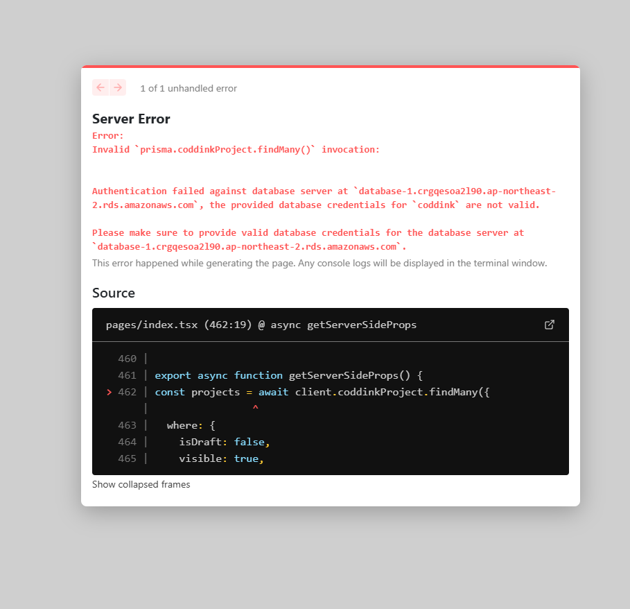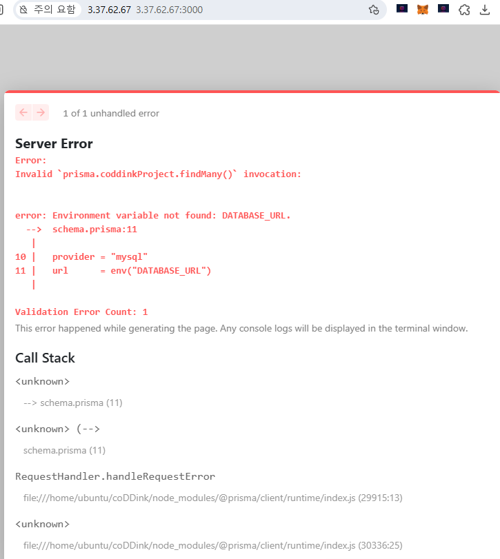 아래 사진의 에러는 .env.production으로 이름을 적었었는데 그냥 .env로 해줬더니 해결했습니다.