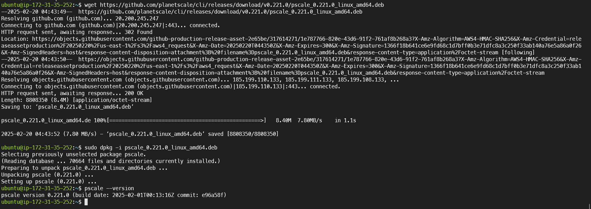 wget https://github.com/planetscale/cli/releases/download/v0.221.0/pscale_0.221.0_linux_amd64.deb