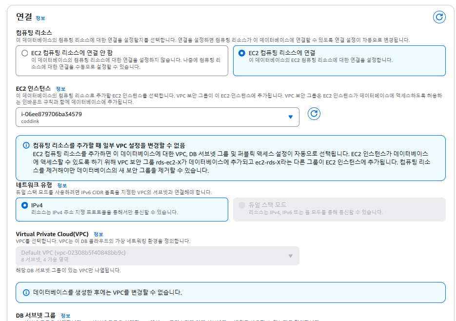 그리고 최근에 알았는데 IPv4를 사용하면 매달 요금이 발생하게 되는데요. IPv6를 사용하거나 EC2를 통해서 RDS에 접근하는 방식으로 비용이 안나오도록 설정할 수 있었어요.