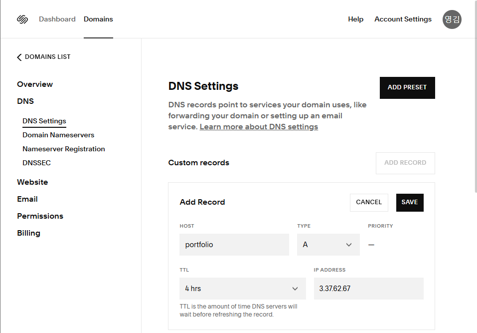 squarespace에 coddink라는 도메인을 다른 사이트에 이용중이라서 앞에 portfoilio.coddink.com으로 연결되도록 DNS 설정을 portfolio, A 타입, EC2 퍼블릭 IP를 입력해줬습니다.