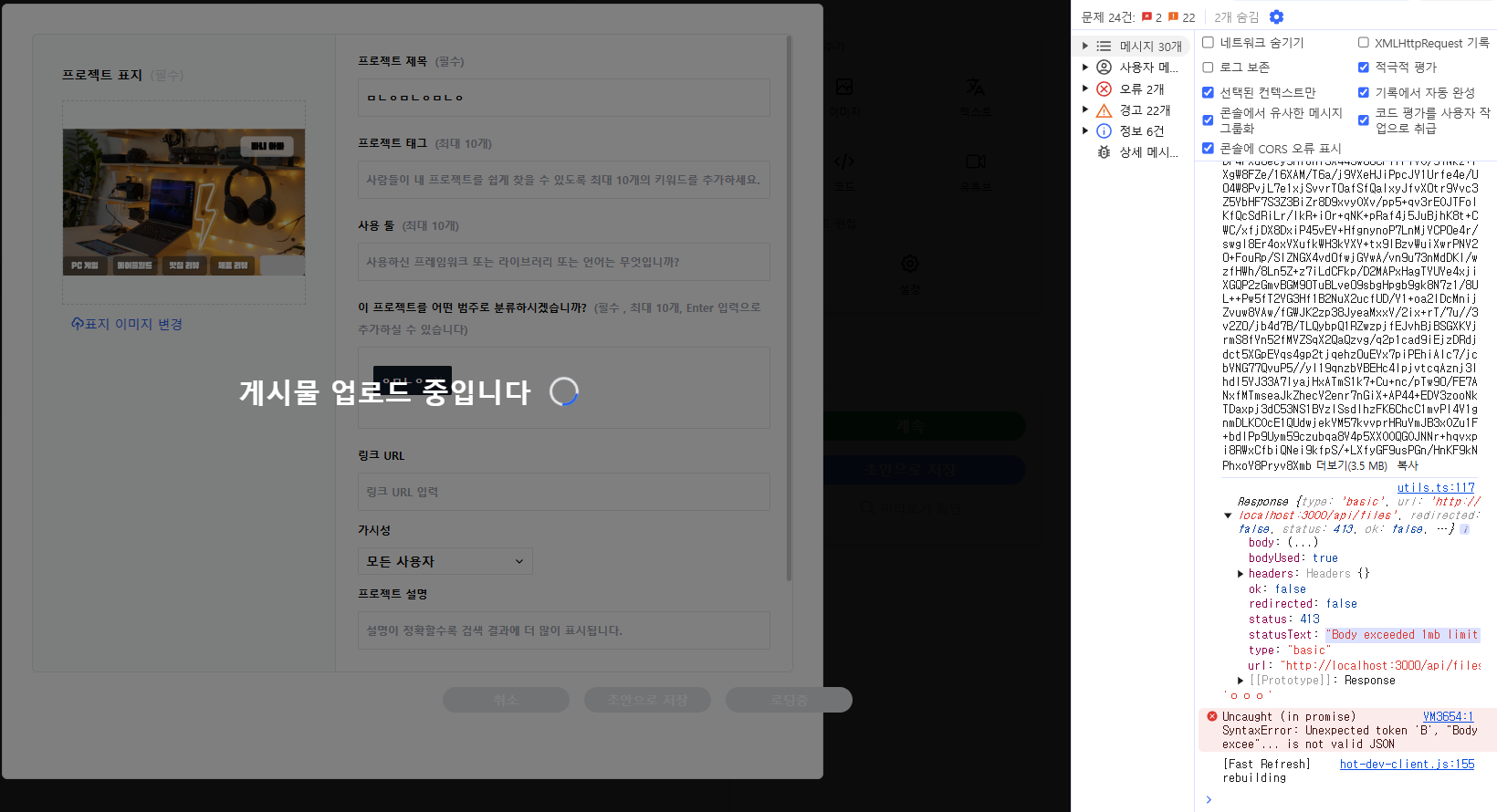 Next.js에서 파일을 업로드할 때, 기본적으로 요청 크기 제한이 1MB로 설정되어 있어 대용량 파일을 업로드하면 문제가 발생할 수 있습니다.