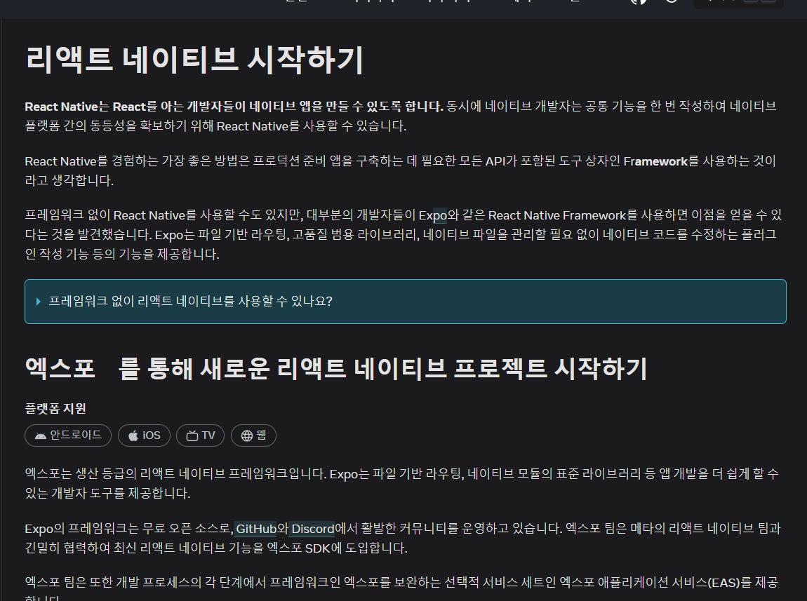 이 글에서는 초기 개발 환경 구성이 더 간편한 Expo를 기준으로 설명하겠습니다. 그리고 공식문서에서도 expo를 권장하고 있었습니다.