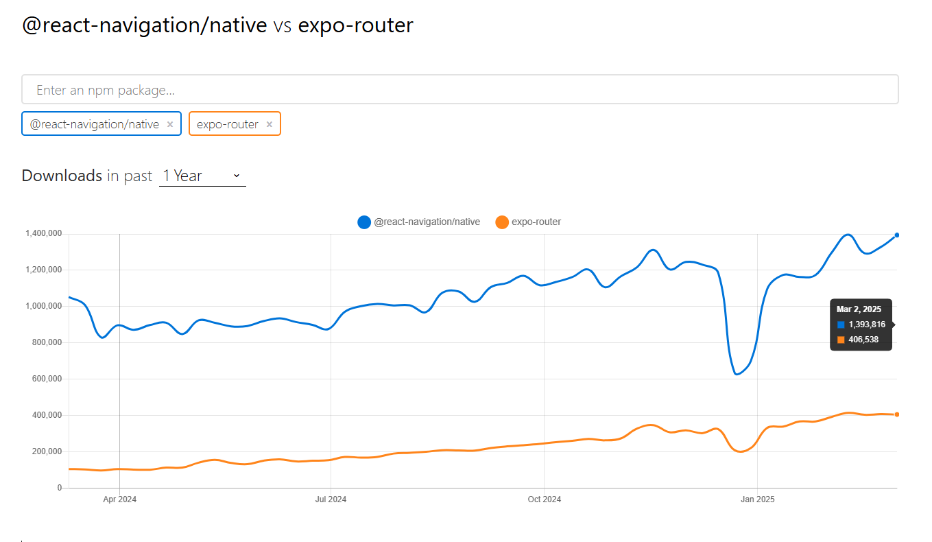 npm trend에서 확인해보면 @react-navigation/native와 expo-router 사이에 큰 차이가 있습니다: