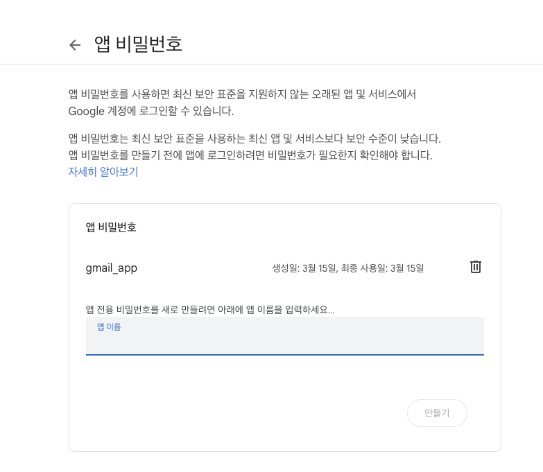 먼저 Google 계정에서 앱 비밀번호를 생성해야 합니다: