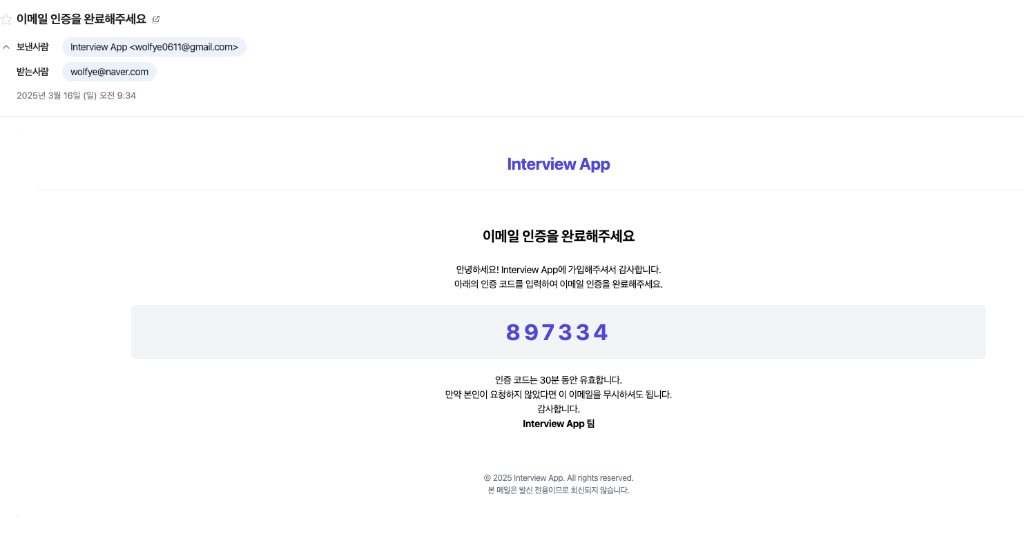 - 인증 코드는 일정 시간(예: 30분) 후에 만료되도록 설정하는 것이 보안상 좋습니다.
