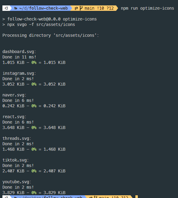 이제 npm run optimize-icons 명령어만으로 모든 아이콘을 한 번에 최적화할 수 있습니다. 새로운 아이콘이 추가될 때마다 이 스크립트를 실행하면 항상 최적화된 SVG 파일을 유지할 수 있습니다.
