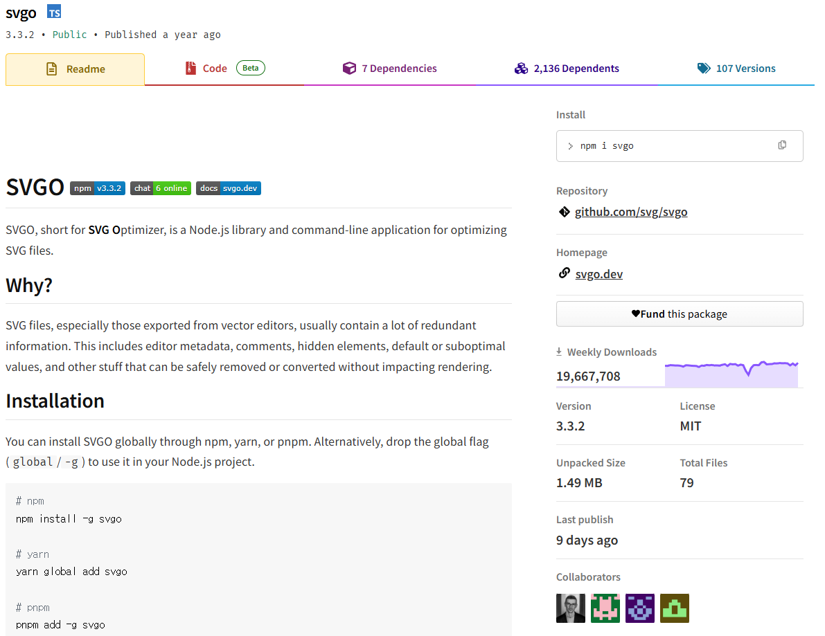 이 문제를 해결하기 위해 svgo 도구를 활용했습니다. SVGO(SVG Optimizer)는 SVG 파일에서 불필요한 마크업을 제거하고 다양한 최적화를 수행하는 강력한 도구입니다.