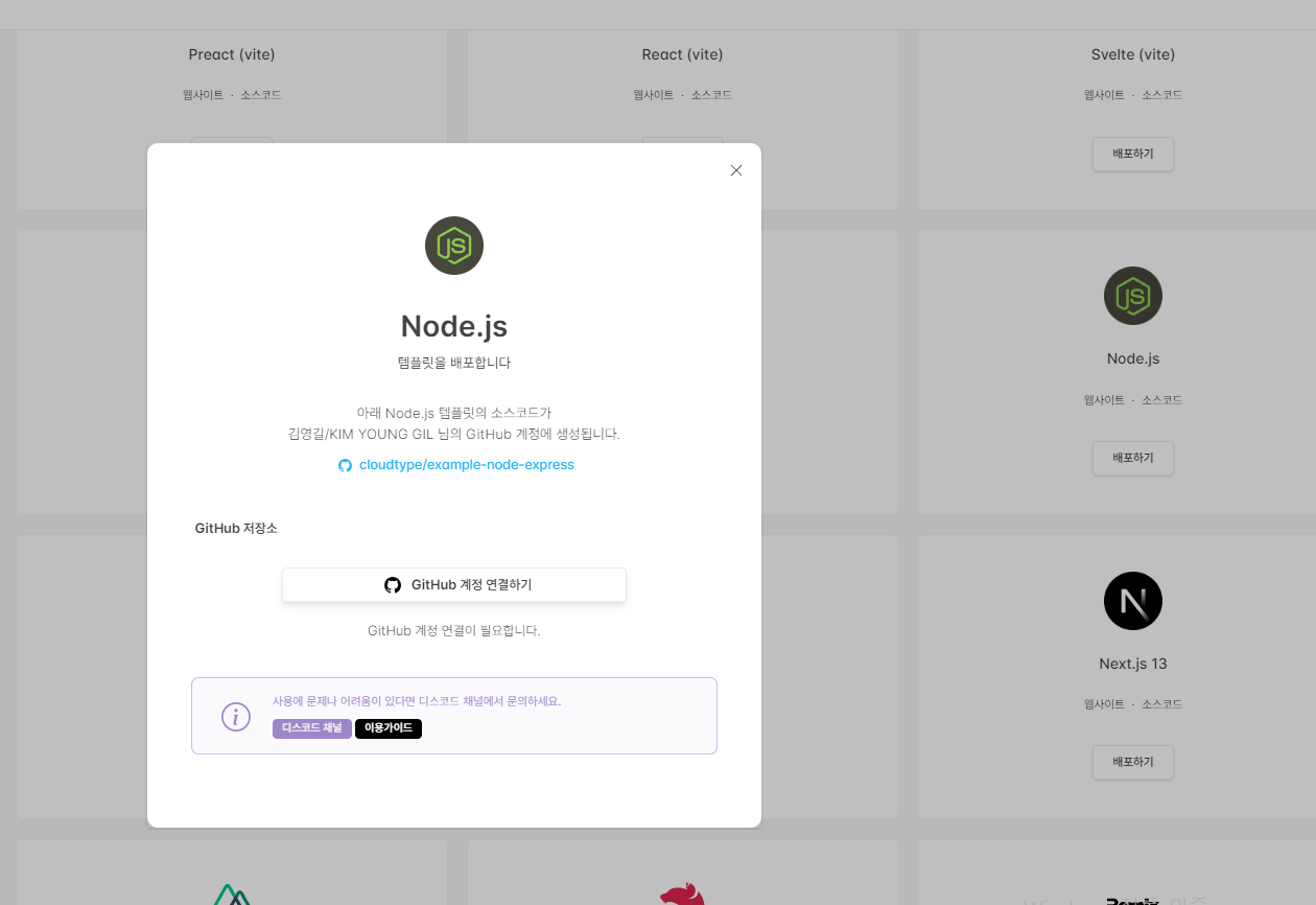깃 허브 계정을 연결 후 원하는 레포지토리를 설정해 줍니다.